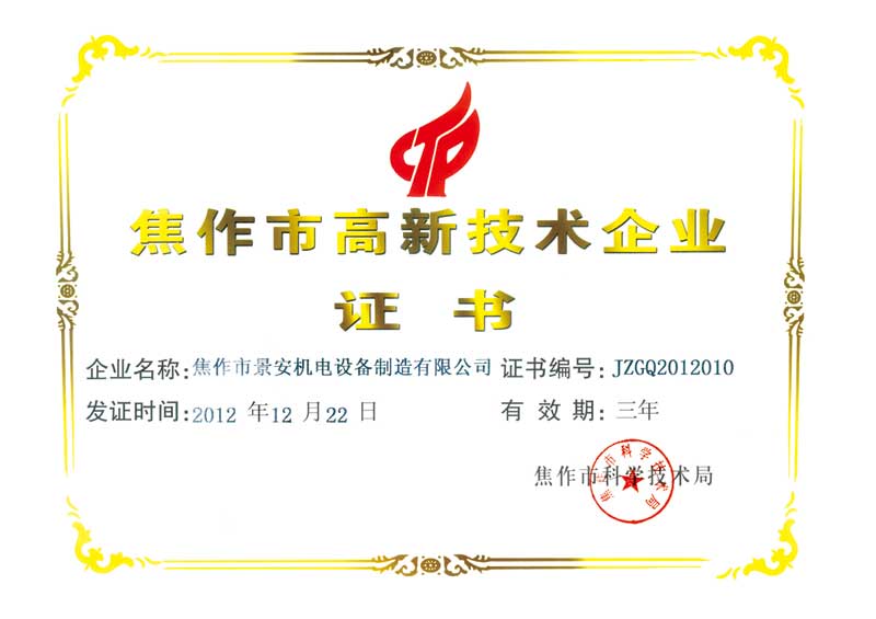焦作市高新技術企業(yè)證書
