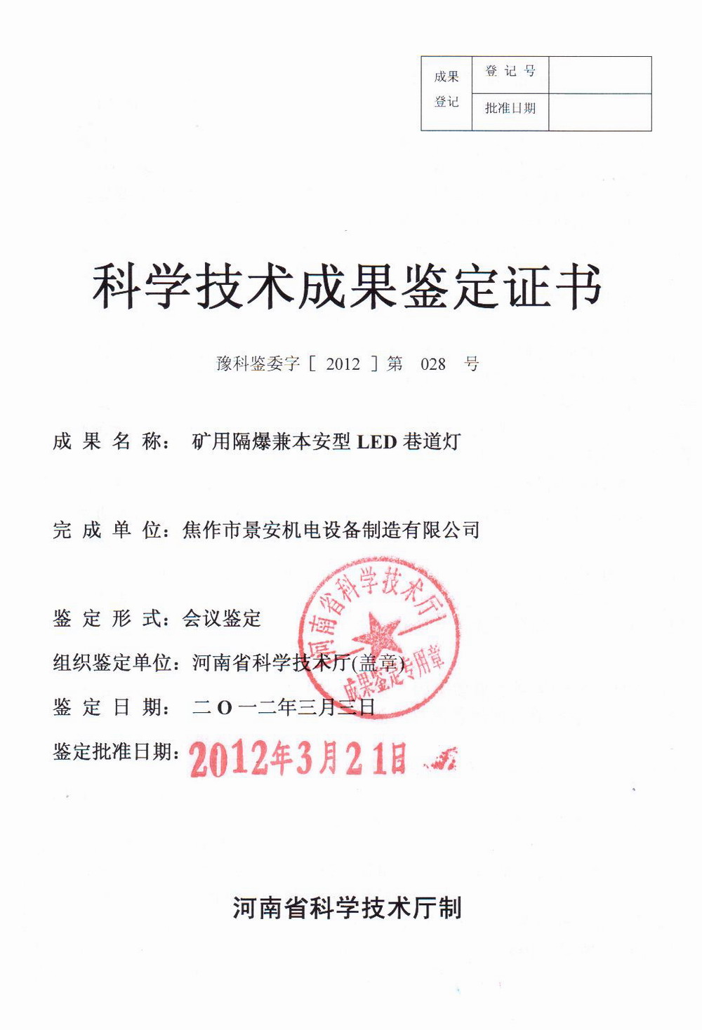 2012年3月21日,我公司研制開發(fā)的“礦用隔爆兼本安型LED巷道燈”項(xiàng)目通過河南省科技廳組織的科技成果鑒定,鑒定委員會一致認(rèn)為:本項(xiàng)目達(dá)到同類產(chǎn)品國內(nèi)領(lǐng)先水平。該項(xiàng)目采用本質(zhì)安全電源技術(shù),設(shè)計(jì)了本質(zhì)安全型疊加恒流源電源,使燈具運(yùn)行穩(wěn)定、安全、可靠;采用防靜電技術(shù)設(shè)計(jì)了光學(xué)透明罩和防塵罩;進(jìn)行了合理的結(jié)構(gòu)設(shè)計(jì),金屬防護(hù)外殼為LED光源散熱,保證燈具連續(xù)使用下微光衰,長壽命,并且具有良好的防塵、防水、防腐性能。